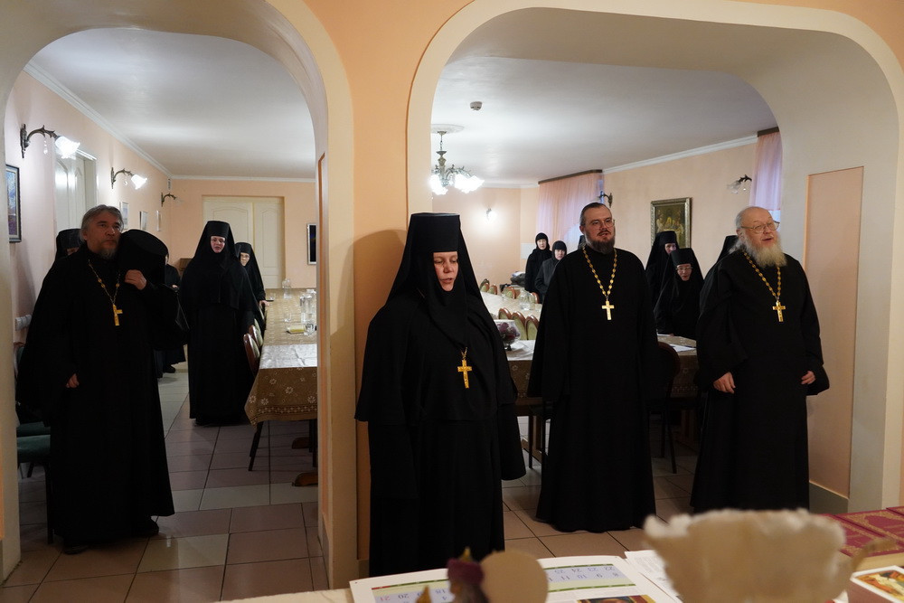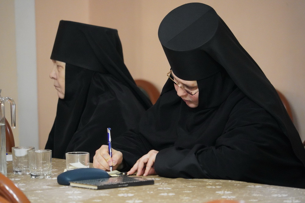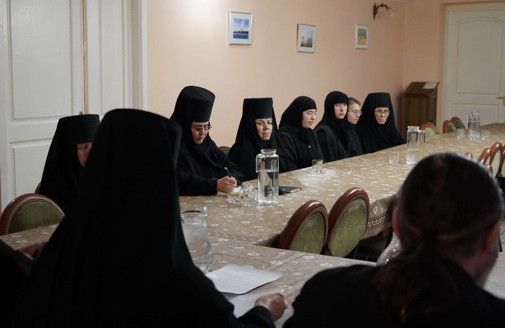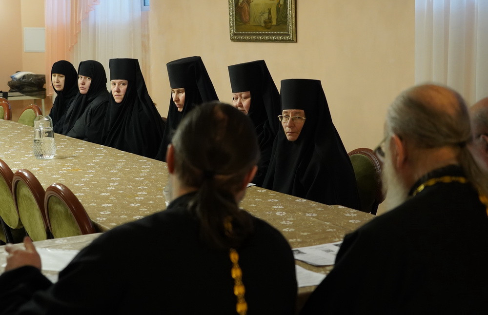 Участники встречи: наместник Свято-Успенского мужского монастыря игумен Софроний (Валов), настоятельница женского монастыря в честь Всех святых, в земле Русской просиявших, игумения Ольга (Василькова), иеромонах Варлаам (Попов), иеромонах Алипий (Федотов), иеромонах Феофан (Груша), насельницы обители обсудили важные вопросы монашеской жизни: