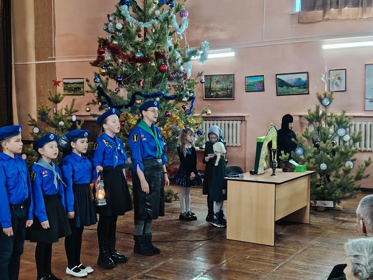 Православные следопыты из отряда имени цесаревича Алексия Братства православных следопытов рассказали о Вифлеемском огне и передали его участникам встречи. Они исполнили рождественские колядки.