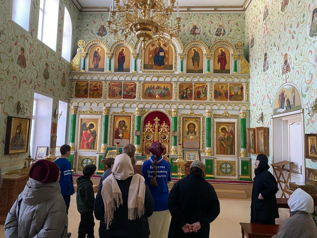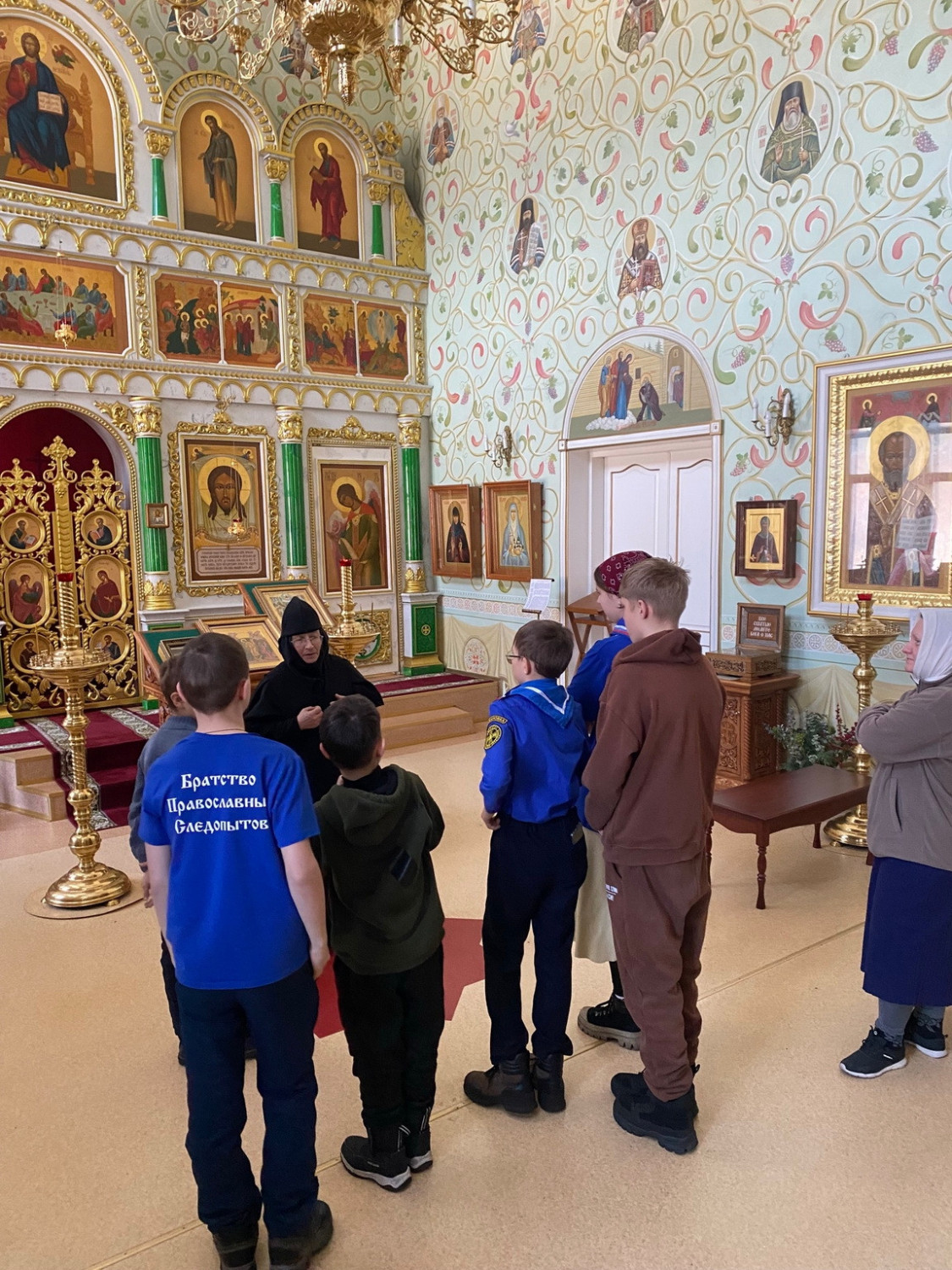 Затем состоялась экскурсия по храму обители, роспись которого посвящена Новомученикам и исповедникам Церкви Русской. Юные следопыты в ходе экскурсии сами определили образ Небесного покровителя отряда – цесаревича Алексия Романова.